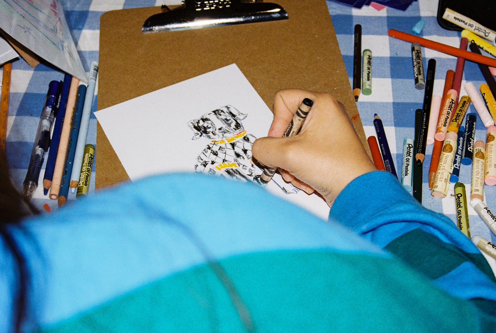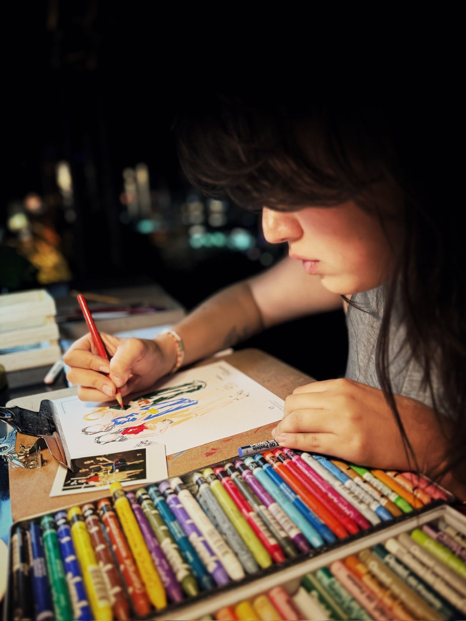 Cada dibujo toma entre 10 y 15 minutos y está hecho con técnicas mixtas como óleo pastel y lápices de color, permitiendo un proceso más detallado y expresivo. Es una experiencia íntima y espontánea, donde el retrato se convierte en un recuerdo único del momento.